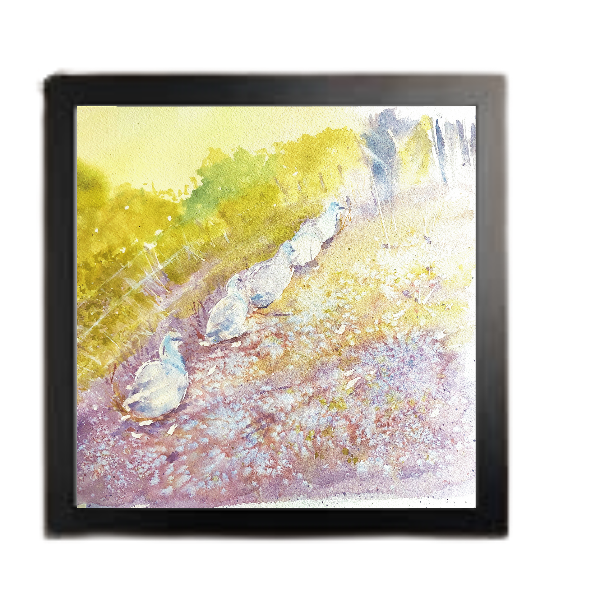 Waddle On is a charming and uplifting art print that celebrates the beauty of moving through life at your own gentle pace. Featuring a serene line of ducks waddling peacefully through nature, this artwork brings a sense of calm and sunny bright energy into any space. The soft watercolor palette and delicate brushwork create a soothing atmosphere, making it a perfect addition to living rooms, bedrooms, nurseries, or any place that deserves a touch of joy.